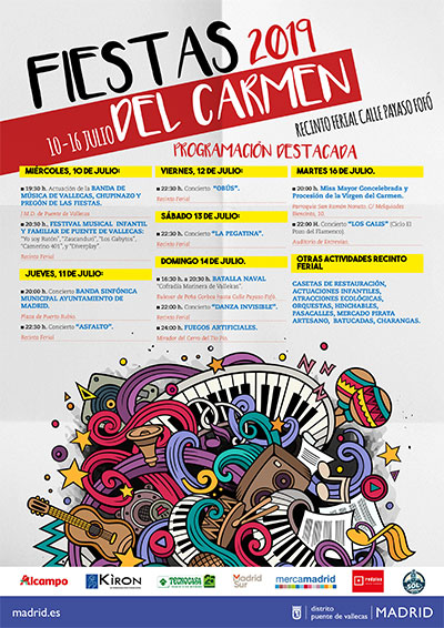 Del 10 al 16 de julio se celebran las fiestas del Carmen 2019 en el distrito de Puente de Vallecas con la tradicional batalla naval, el gran festival infantil y los conciertos de Asfalto, Obús, La Pegatina, Danza Invisible y Los Calis.