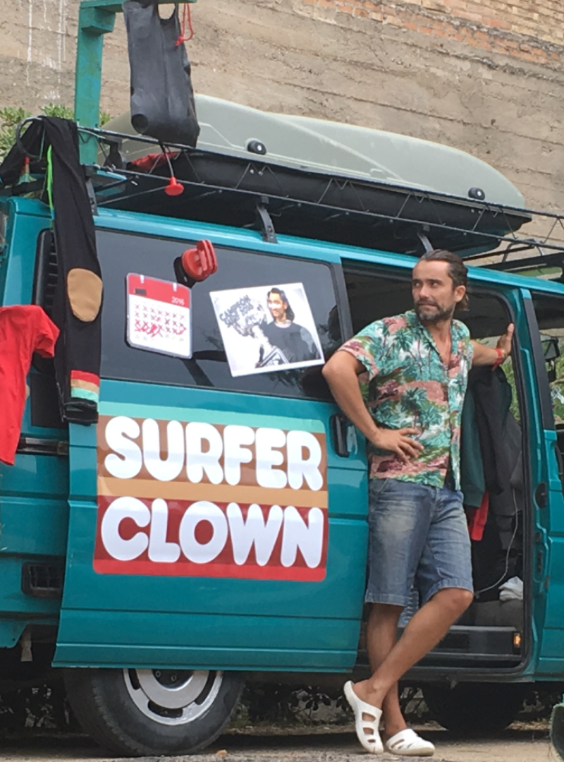 - Surfer Clown. Surfer Clown es una comedia gestual para todos los públicos, inspirada en el mundo del Surf. El protagonista al nacer no rompió aguas, las surfeó. Llega con su furgoneta surfera y excéntrica cerca del spot, es allí donde se encuentra con sus primeros inconvenientes para salir con su tabla a cabalgar olas, tendrá que esperar el momento adecuado para la ola perfecta, mientras tanto, prepara su día de acampada surfera con los asistentes que lo idolatran.