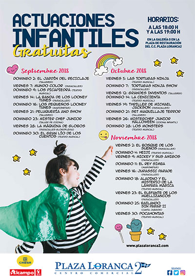 Los viernes y los domingos, bien en la galería o en la plaza de restauración, podremos disfrutar de Talleres, Pasacalles, Teatro, Marionetas o Teatro Musical.