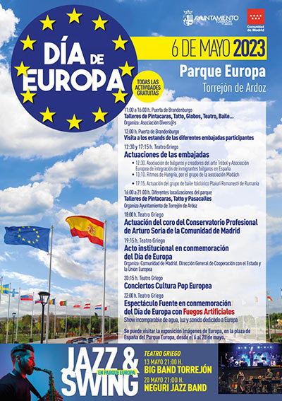 Torrejón de Ardoz celebra el Día de Europa mañana sábado, 6 de mayo, con un Acto Institucional, el espectáculo Fuente con fuegos artificiales, conciertos y diferentes actuaciones, entre otras actividades