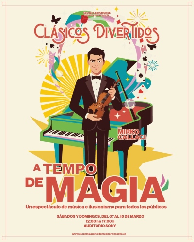 Bajo el título “A tempo de magia”, el escenario se transforma en un espacio donde todo es posible. El ilusionista argentino Mirko Callaci y los jóvenes talentos de la Escuela Reina Sofía crearán un juego constante entre sonido y asombro. Las grandes obras del repertorio clásico, de compositores como Beethoven, Debussy, Sarasate o Shostakovich se transformarán en misterio, magia y fantasía.