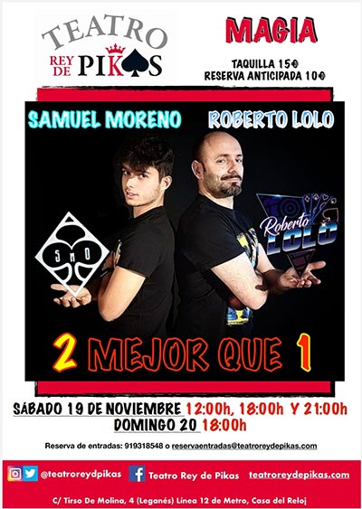 En el Teatro Rey de Pikas tenemos la suerte de tener el show conjunto 2 mejor que 1, de dos grandísimos magos, Roberto Lolo y Samuel Moreno, para llenar de magia, risas y diversión el escenario.