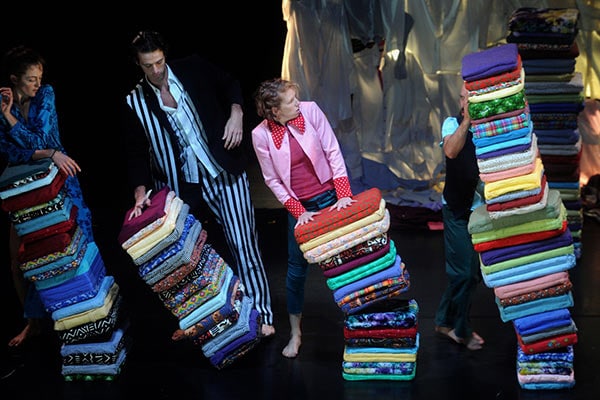 Pero, poco a poco, la ropa recupera su carácter personal y el espacio se transforma, como un patio de recreo móvil en perpetua construcción. Se abre un mundo imaginario: un armario se despliega, un baúl revela sus misteriosas profundidades, las pilas de ropa se convierten en los ladrillos de una casa… Las individualidades nacen y se afirman.
