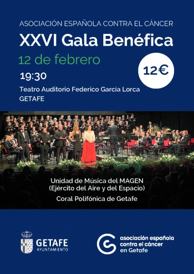 Un año más la Asociación Española contra el Cáncer organiza la Gala Benéfica con la participación de la Coral Polifónica de Getafe y la Unidad de Música MAGEN del Ejército del Aire, con un repertorio variado y una segunda parte dedicada a la zarzuela.