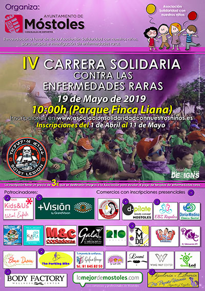 IV Carrera Solidaria contra las enfermedades raras, incluida dentro de las actividades en torno al «Día del Deporte 2019» (organizado por el Ayuntamiento de Móstoles, a través de la Concejalía de Deportes) podrán inscribirse hasta el 11 de mayo en www.asociacionsolidaridadconnuestrosniños.es