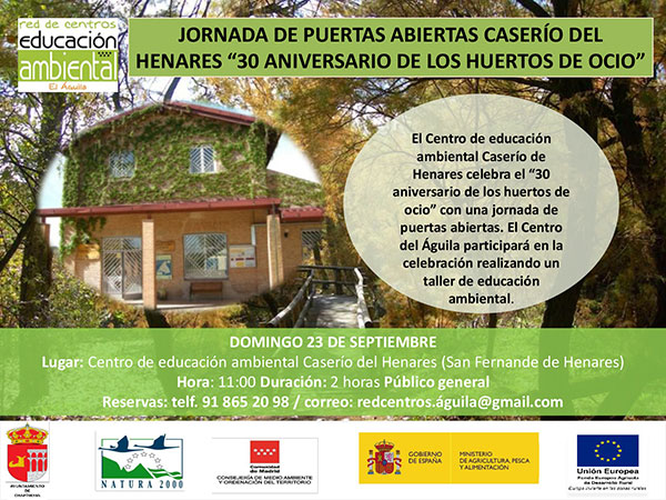 El Centro de educación ambiental Caserío de Henares celebra el “30 aniversario de los huertos de ocio” con una jornada de puertas abiertas. El Centro del Águila participará en la celebración realizando un taller de educación ambiental.