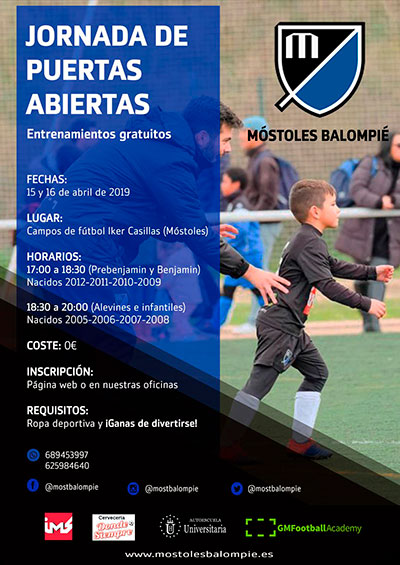 El Móstoles Balompié ha organizado una jornada de puertas abiertas para que niños nacidos de 2005 a 2012. Vamos a realizar unos clinics de tecnificación totalmente gratis y sin ningún tipo de compromiso. La fecha será el 15 y 16 de abril aprovechando los días de vacaciones que tienen los más pequeños en Semana Santa.