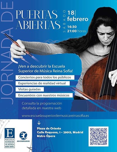 El próximo sábado 18 de febrero, de 16:30 a 21:00 horas, la Escuela Superior de Música Reina Sofía abre sus puertas al público, en una tarde en la que se podrá disfrutar de conciertos en directo, visitas guiadas, experiencias de realidad virtual, encuentros con alumnos y sorteos de entradas.