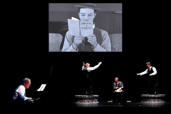 En Keatoniana, espectáculo creado por Jordi Sabatés junto al grupo de baile y percusión Camut Band, se cristalizan magistralmente la coexistencia de cine, música en directo, claqué y percusión africana.