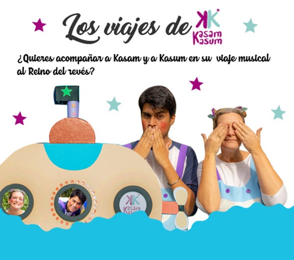 ¿Quieres acompañar a Kasam y a Kasum en su viaje musical al Reino del revés? Juntos nos sumergiremos en un submarino amarillo para observar el fondo del mar y recorreremos una laguna algo peculiar donde vive un monstruo al que le gusta bailar. Además, sin prisas, la tortuga Manuelita nos guiará por nuestro viaje. ¡Ah! y al llegar la noche, aprovecharemos la luz de la luna para cantar y hacer teatro de sombras. ¡¡Súperdivertido!!