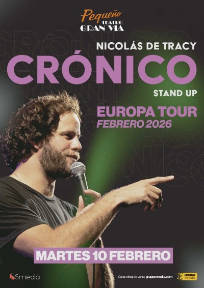 Crónico, Tour Europa 2026 de Nicolás de Tracy, el tercer unipersonal del comediante de Stand up con mayor crecimiento este último tiempo en el Pequeño Teatro Gran Vía de Madrid. Actor y comediante que se hizo conocido en las redes sociales a partir de sus vídeos de humor simple, espontáneo y sorpresivo nos presenta el show con el cual se encuentra girando actualmente.
