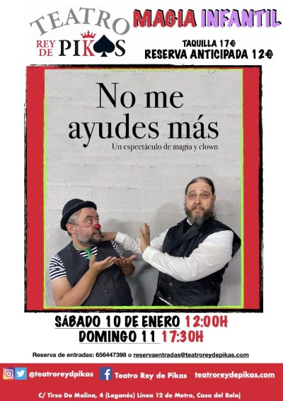 El sábado 10 de enero a las 12h y el domingo 11 a las 11:30h, tendremos el espectáculo de magia y clown familiar/infantil «No me ayudes más». A partir de 3 años. Espectáculo con varios premios Nacionales.