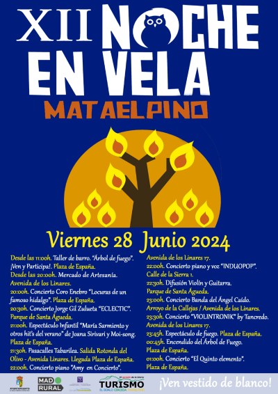 Además… ¡la música toma las calles! Actuaciones y música en directo en diversos escenarios y localizaciones escogidas del entorno de Mataelpino. Solo se exige ganas de divertirse… y venir vestido de blanco a la noche más mágica del año.