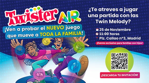Acude a la presentación especial de Twister Air, la última innovación en diversión de Hasbro. Y para hacerlo aún más emocionante, tendremos a las divertidas artistas Twin Melody, para animar la fiesta y al reconocido presentador de «La casa de los Retos», David Moreno.