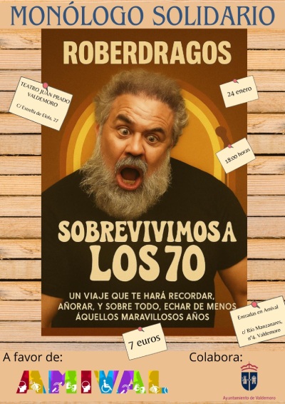 El Teatro Municipal Juan Prado acoge el 24 de enero, a las 18:00 h, el monólogo Sobrevivimos a los 70, a cargo del cómico Roberdragos, organizado por Amival (Asociación de personas con discapacidad de Valdemoro).