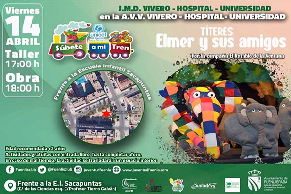Las familias podrán disfrutar de la obra de títeres “ELMER y sus amigos”. El Presentador Arlequín y Fuenli, presentarán los personajes de este clásico de la Literatura infantil contemporánea, reafirmando el lema “ Fuenli, reflejo de nuestra infancia”. Elmer es un elefante de colores, diferente que quiere realizarse, participar y formar parte de la manada de una forma diferente mostrando que la inclusión y el respeto por la diversidad es posible.