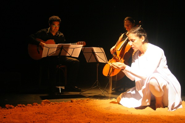 Sandra Vargas, autora del texto y directora e intérprete de Terra (Tierra), acompañada por música en directo (guitarra y violonchelo), revive momentos vividos con su abuela, que la perfumaba con ternura; con su padre, en cuyos brazos aprendió a nadar bajo un cielo que se parecía al mar; y con su madre, que le contaba historias para espantar el miedo a la oscuridad.