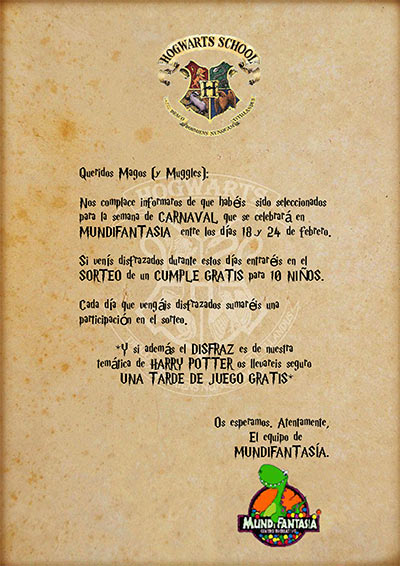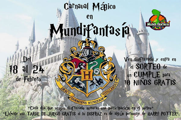 Nos declaramos fans indiscutibles de la saga Harry Potter, y este carnaval 2020 queremos premiar a todos los que comparten nuestra misma pasión. Mundifantasía se convierte en Hogwarts y animamos a todos los niños a venir disfrazados de su personaje favorito de Harry Potter. Solo por hacerlo te llevarás un fantástico premio… ¡una tarde de juegos gratis en Mundifantasía!