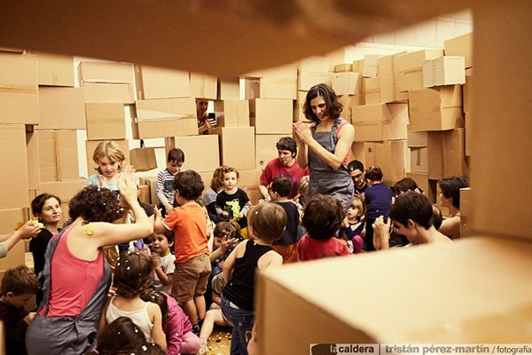 El espectáculo siempre es diferente. Todo el mundo improvisa y propone en este mundo de cartón que se construye en torno a la narración del cuento. La historia va haciendo que los niños se metan en la piel de los protagonistas, tratando de resolver el cuento. Tras el espectáculo, comienza un tiempo de juego libre, en el que pequeños y mayores echan a volar su imaginación. A lo largo de la instalación, se generan sinergias entre el público, dando lugar a construcciones colectivas y juegos. La propuesta finaliza con la recogida conjunta de todas las cajas, devolviendo el espacio a su estado inicial.