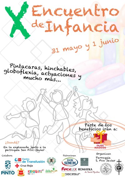 Una fiesta familiar para todos los vecinos de Pinto, los días 31 de mayo y 1 de junio. Y es que este fin de semana tiene lugar el X Encuentro de la Infancia en nuestra ciudad, organizado por la Parroquia de San Francisco Javier y la Hermandad del Nazareno y San José Obrero, con la colaboración del Ayuntamiento de Pinto.