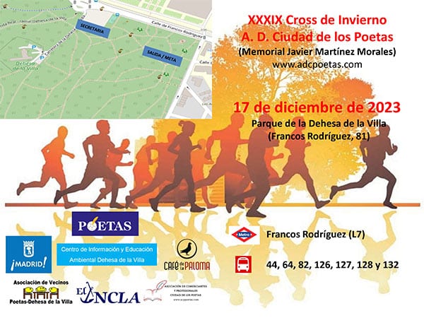 La A.D. Ciudad de los Poetas organiza el XXXIX Cross de Invierno Ciudad de los Poetas, el domingo 17 de diciembre de 2023 en el parque natural de la Dehesa de la Villa de Madrid (Francos Rodríguez 81).